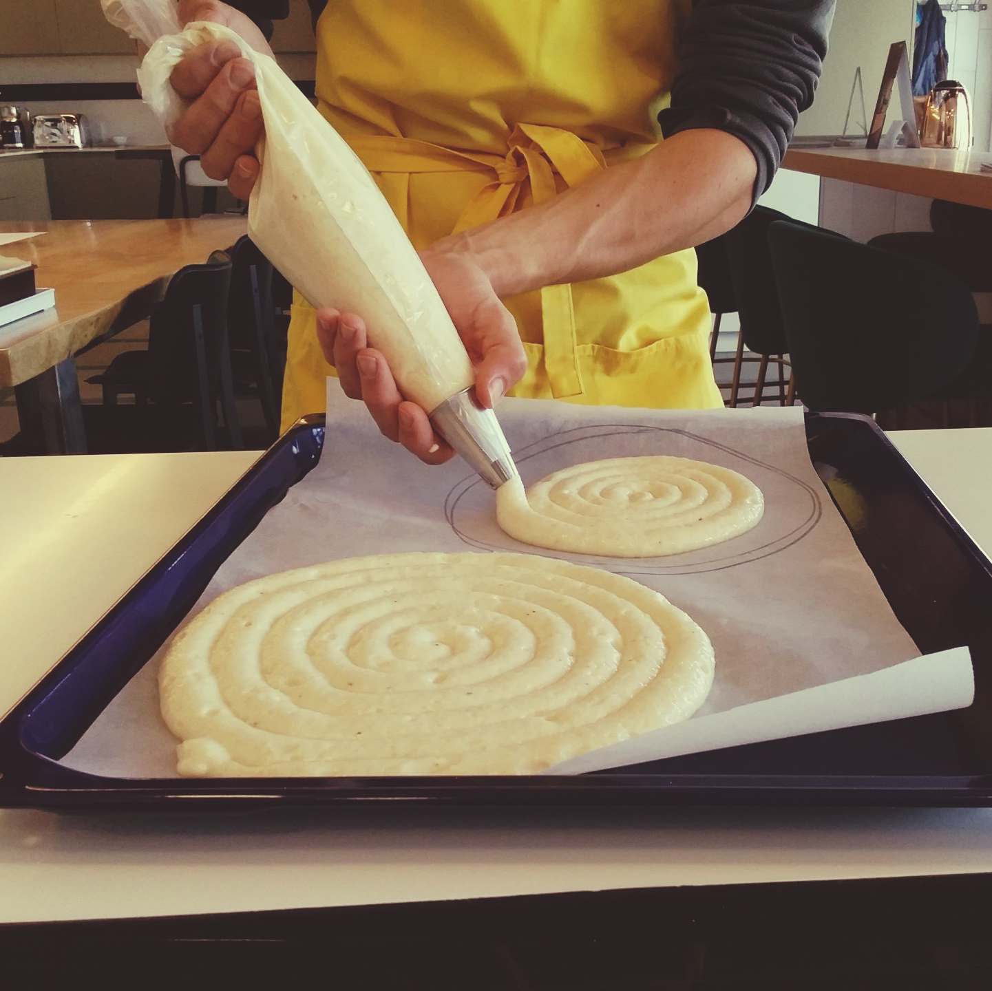 Réalisation d'une dacquoise aux amandes, d'une crème légère à la vanille et montage du gâteau avec des fruits frais.